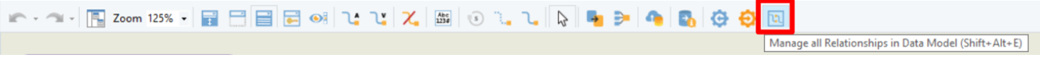 To open the relationship manager, select the Manage all Relationships in Data Model icon from the toolbar, or use the shortcut key, Shift+Alt+E.