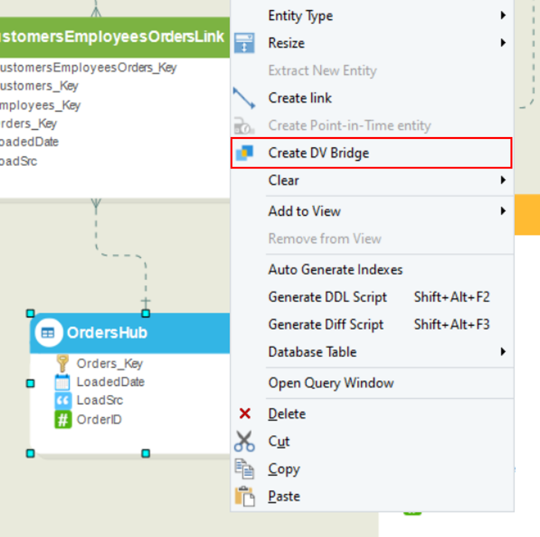 To add a bridge table to a data vault, select the Hubs you want the bridge table to cover, then right-click on any one of the selected Hubs and select the Create DV Bridge option from the context menu.