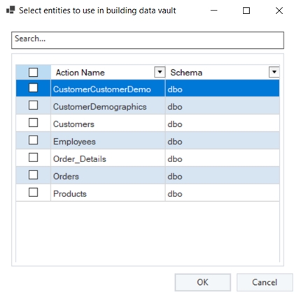 Upon selecting the Build Data Vault Model option, the Select entities screen will prompt you to select entities required to be modeled into a data vault. Entities can also be searched using the search bar, and filtered based on entity name and schema, using the filter option. Once you have selected the entities to be modeled, click OK.