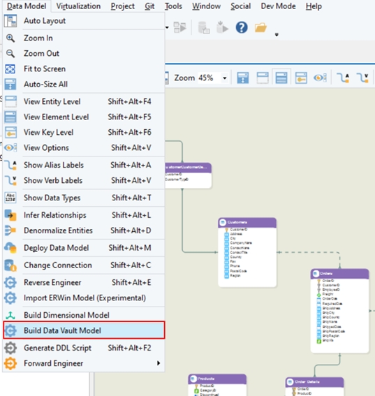 To use the data vault automation algorithm, select Data Model -> Build Data Vault Model from the Data Model drop-down menu.