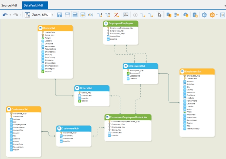 The data vault automation feature does not simply create Hubs, Links, and Satellites for every underlying entity, but also models different kinds of relationships, such as self-relationships, many-to-many relationships, unit of work relationships, and multiple relationships between entities.