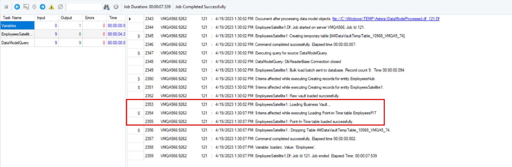 Additionally, when loading the Satellites, you can monitor the loading of the PIT table from the Job Progress window.