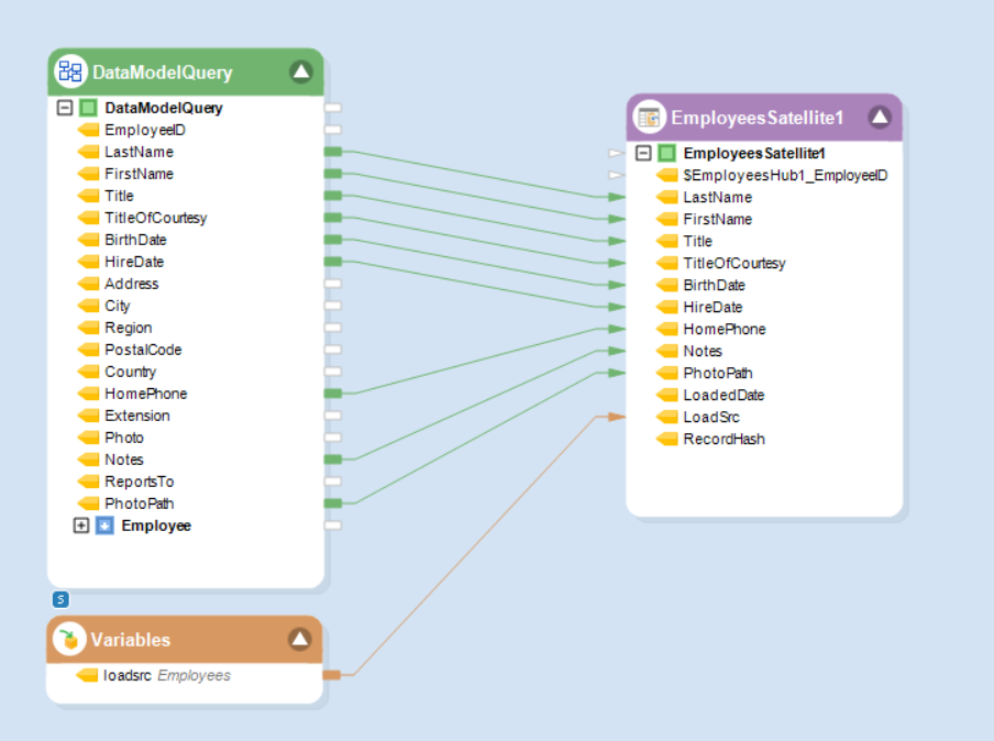 For example, the Employees_Key represents the primary key of Employees Hub, the EmployeesSatellite1_LoadedDate represents one of the primary keys of EmployeesSatellite1 Satellite, etc.