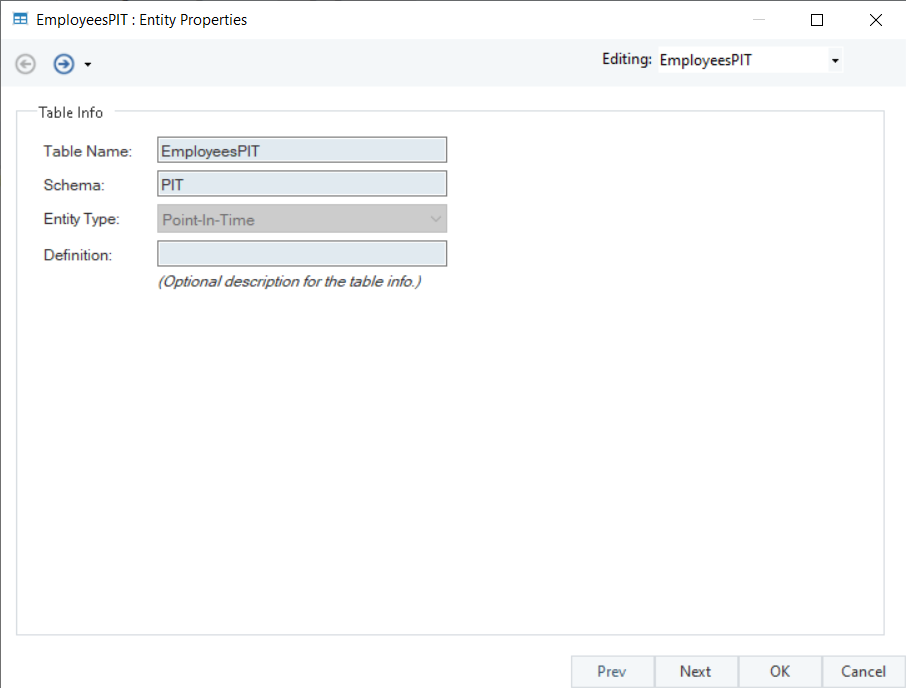 The PIT entity’s properties window provides the same options as it does for a general entity. On the Entity Properties screen, you can view and edit the table name and schema, but you cannot edit the entity type as doing so would alter the properties of the PIT table, such as entity roles
