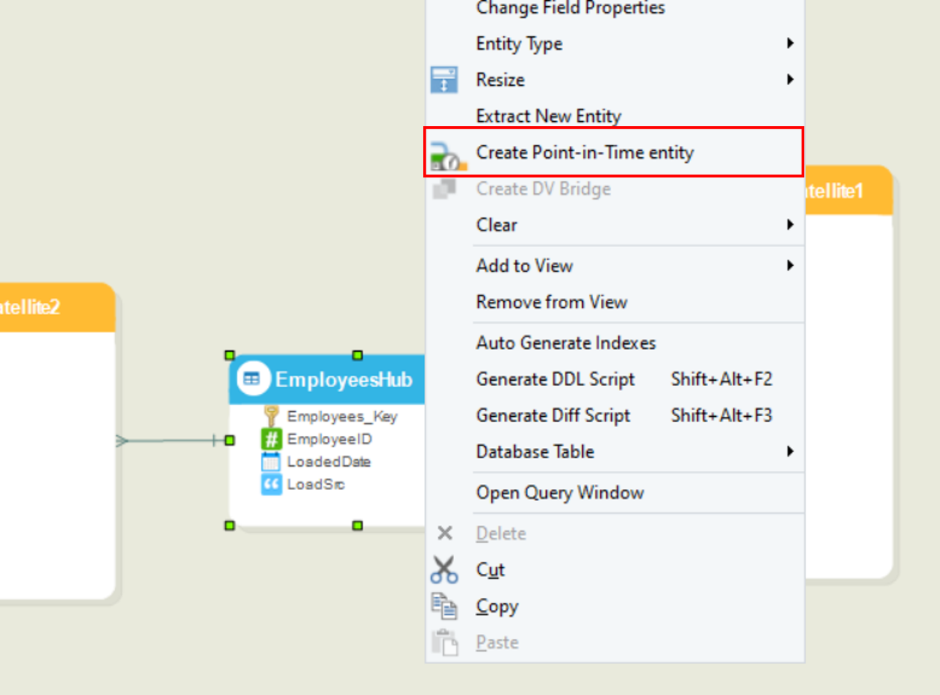 If there are less than two Satellites linked to a Hub or Link, the Create Point-in-Time entity option will be disabled.