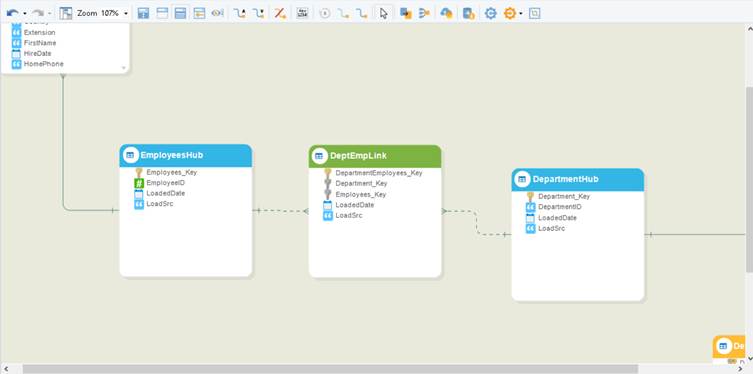 When converting to a data vault, both tables will be converted into Hub tables, EmployeeHub and DepartmentHub, and the relationship between them will be converted into a Link table, which consists of incoming keys from both Hub tables.