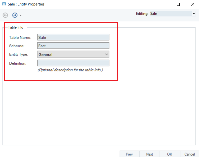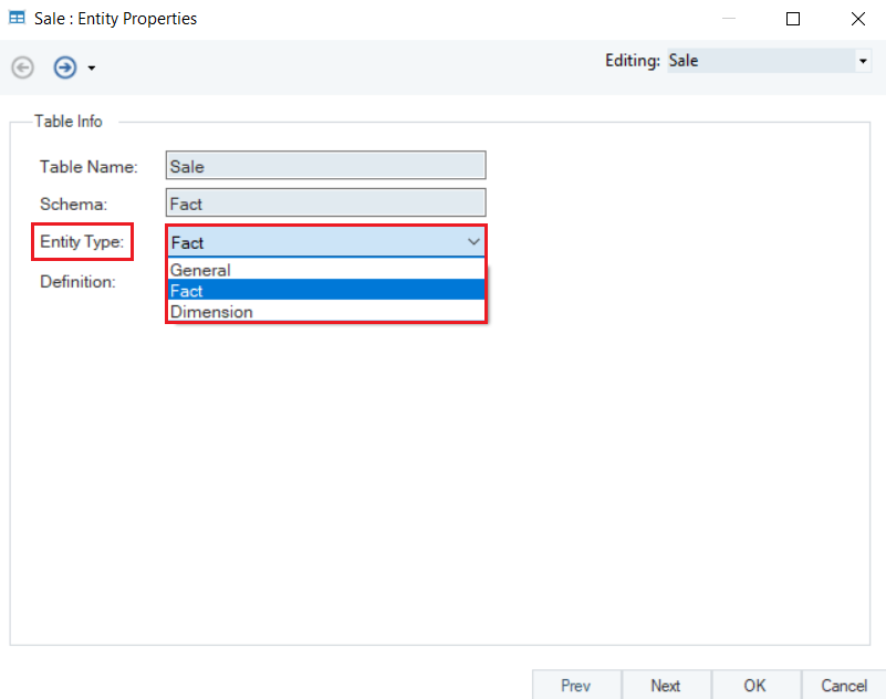 Once a Fact table has been specified, all the other tables in the model would be dimension tables, in this case only. To change an entity to a Dimension, follow steps 3 and 4. In the Entity Type drop-down, select Dimension. Click Next.