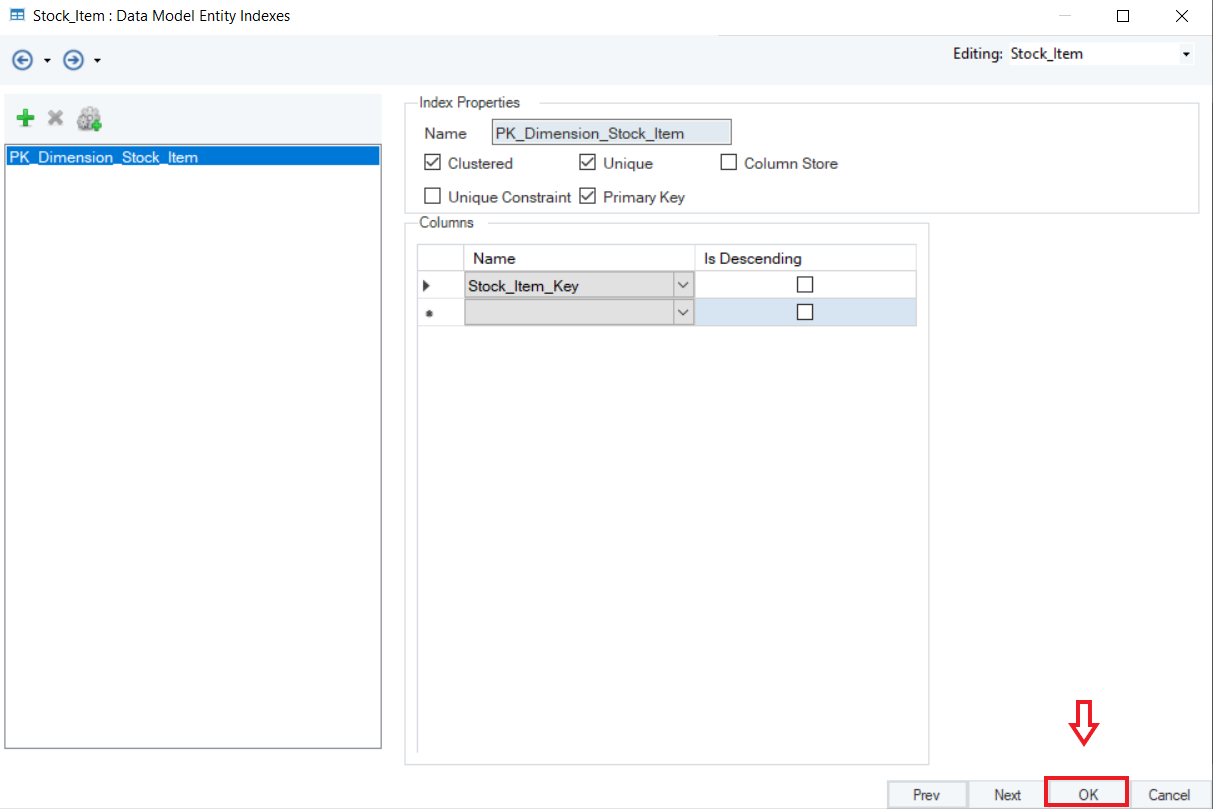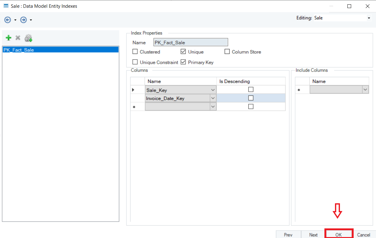 The next screen is for Data Model Entity Indexes. Once you have set the properties for the fact entity, click OK.