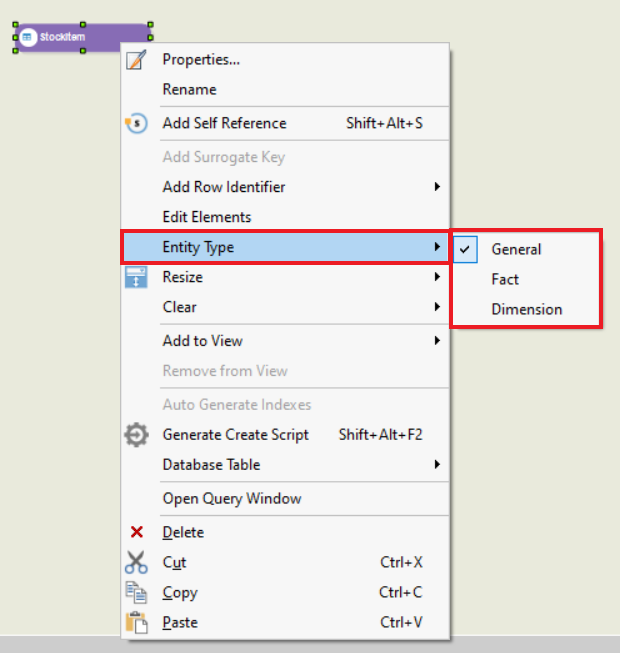 Right click on the entity you want to change, and hover over the Entity Type option. You will get the option to choose an entity type between General, Fact and Dimension. Select the type that you want to assign.