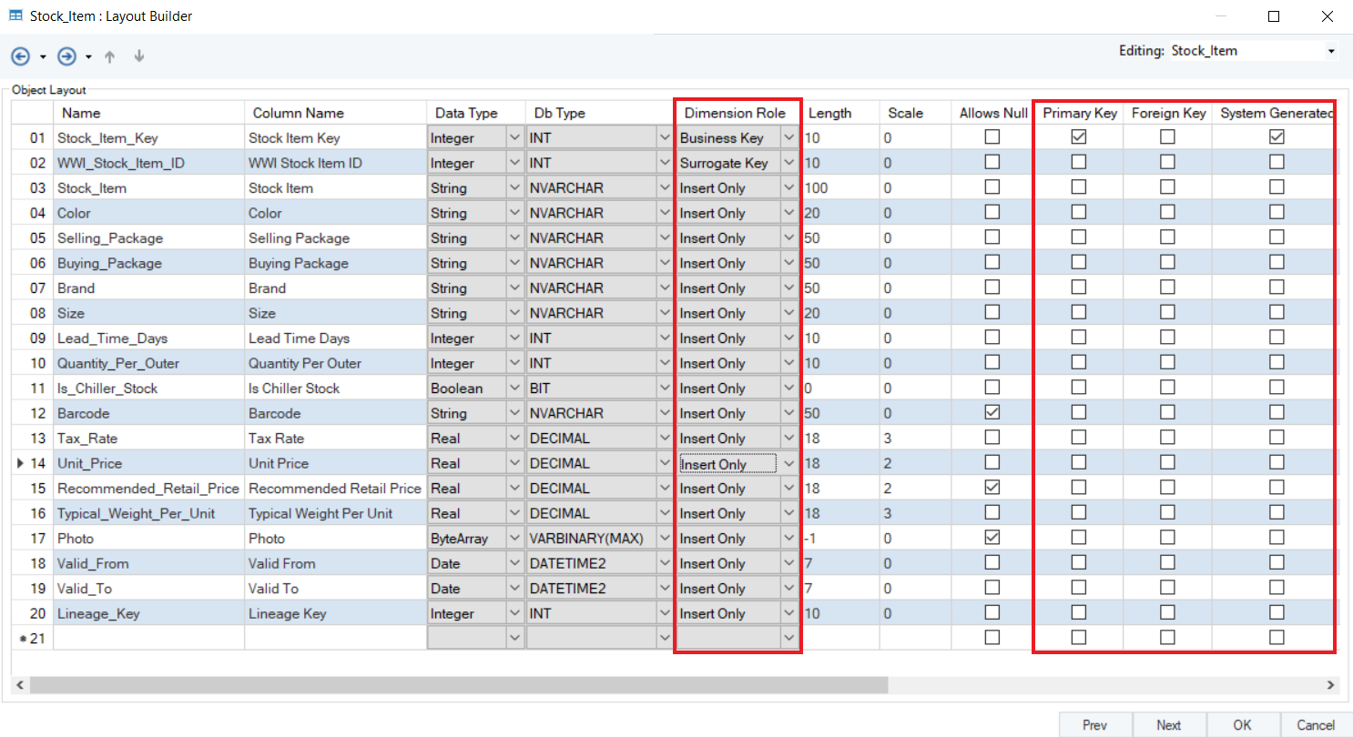 On the Layout Builder screen, you can make modifications to the table. Specify the Dimension Role (Business Key, Surrogate Key and SCD Types) and the Keys in the dimension table.