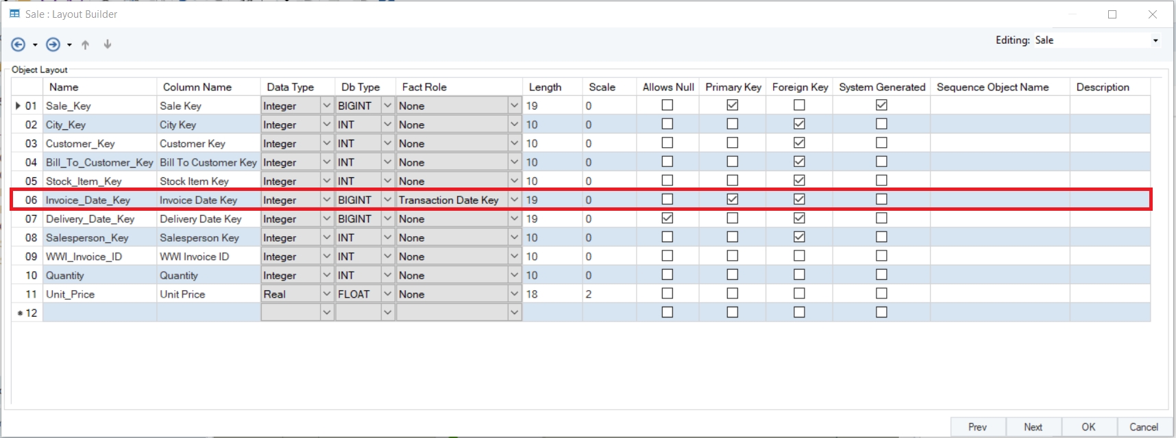 The Fact Role column in the layout builder provides a dropdown menu for you to assign the role of Transaction Date Key to one of the fields.