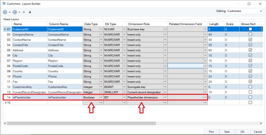 The placeholder dimension is identified by the ‘IsPlaceholder’ field, if the value of this field is ‘1’ (which indicates that the Placeholder field is True), it shows that the record is a placeholder in the dimension table.