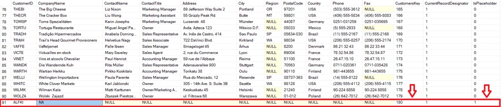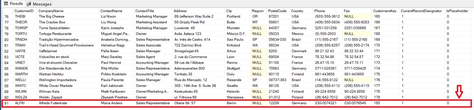 When the actual data for the customer where CustomerID = ‘ALFKI’ arrives, the placeholder dimension record is updated with the new information and the ‘IsPlaceholder’ value changes to zero indicating that it is no longer a placeholder record, and therefore the Placeholder field is False.