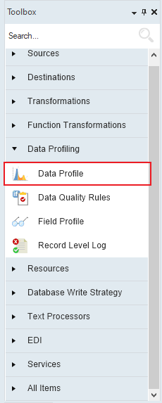 To get the Data Profile object from the Toolbox, go to Toolbox > Data Profiling > Data Profile. If you are unable to see the Toolbox, go to View > Toolbox or press Ctrl + Alt + X.