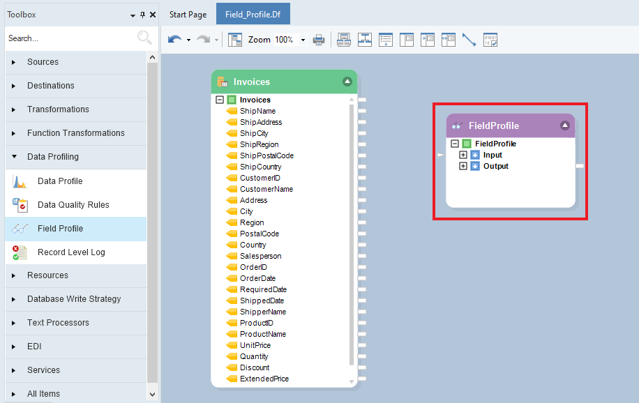 To get a Field Profile object from the Toolbox, go to Toolbox > Data Profiling > Field Profile. If you are unable to see the toolbox, go to View > Toolbox or press Ctrl + Alt + X.