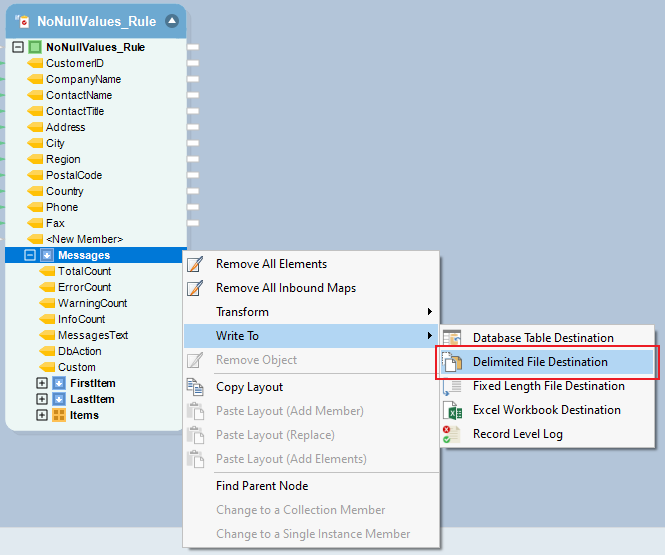 Right-click on the Messages node inside the NoNullValues_Rule object and go to Write to > Delimited File Destination.