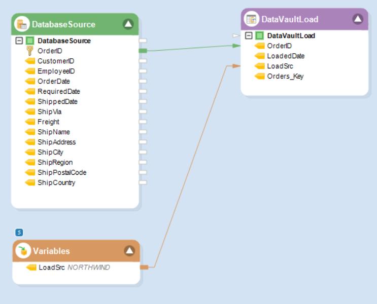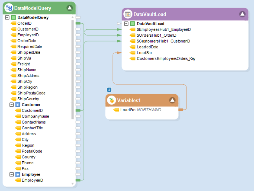 For our use case, we will be using the Data Vault Loader object to write data to an Orders Hub, a Customers-Orders Link, and an Orders Satellite.