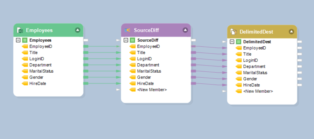 Drag-and-drop the Source Diff Processor object from Toolbox > Database Write Strategy > Source Diff Processor onto the dataflow designer and map the source data to it.