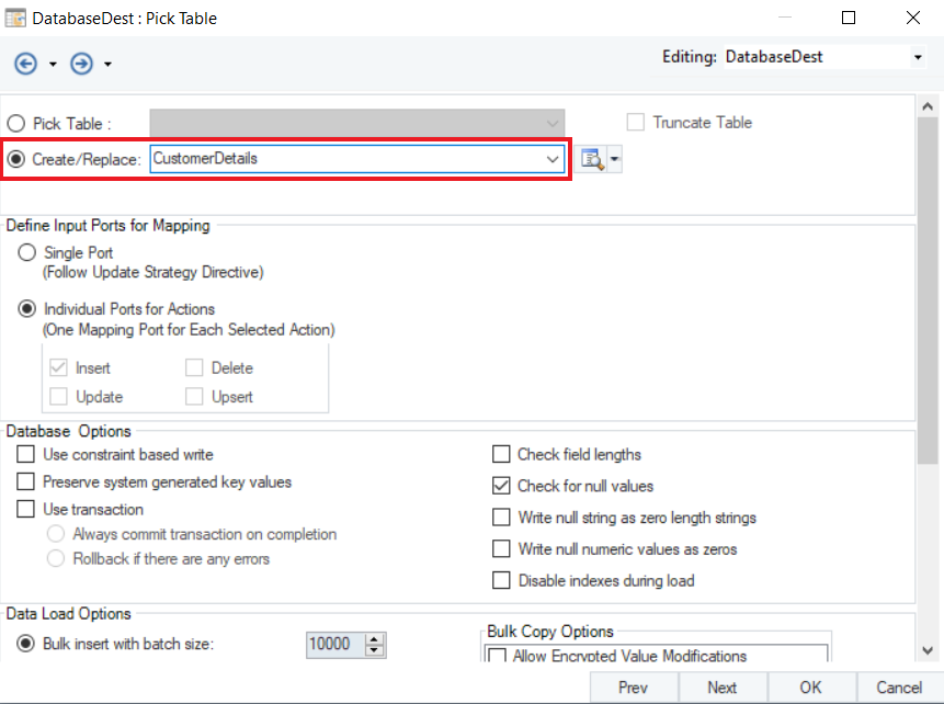 Choose the option based on your requirement. In this case we will select the Create/Replace Table option and create a new table in the database.