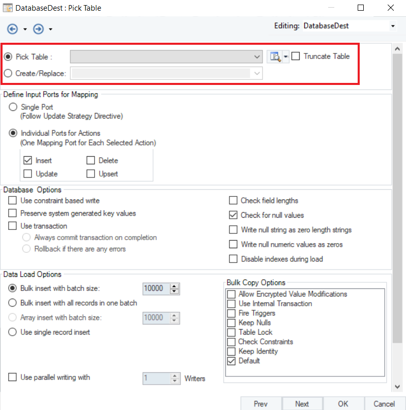 Keep Nulls: Preserves null values in the destination table regardless of the settings for default values. When not specified, null values are replaced by default values where applicable.