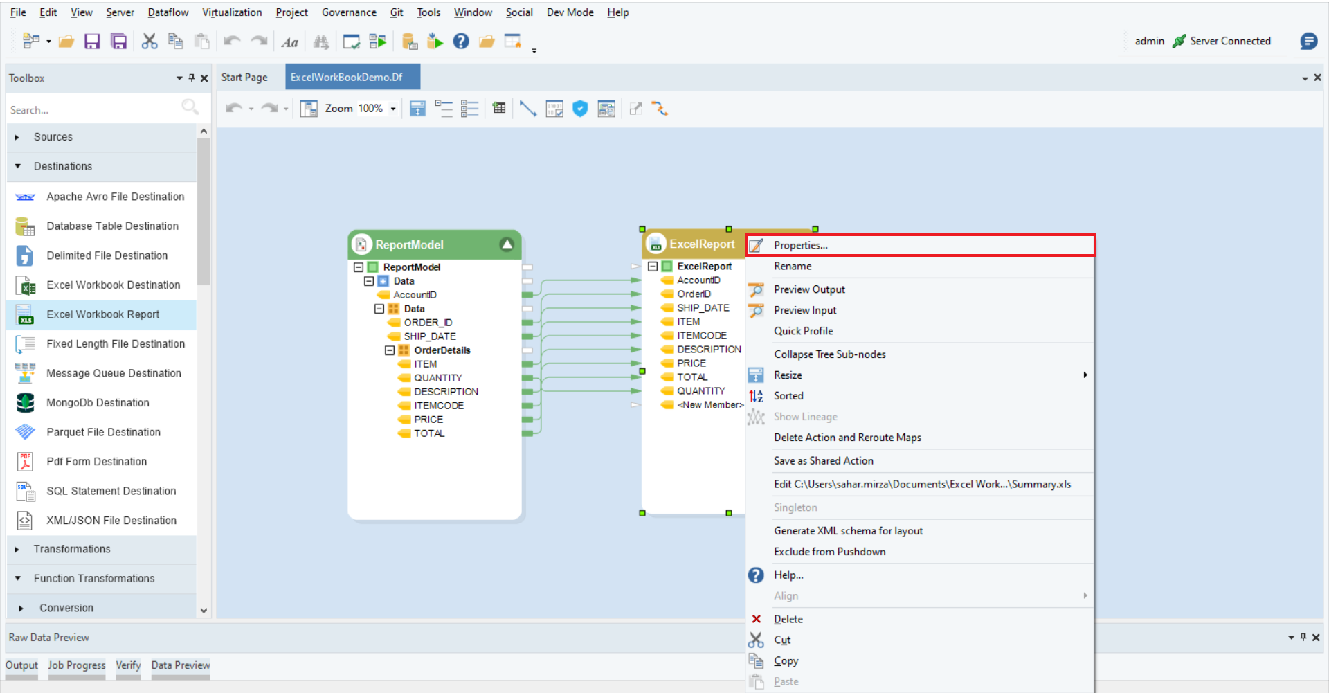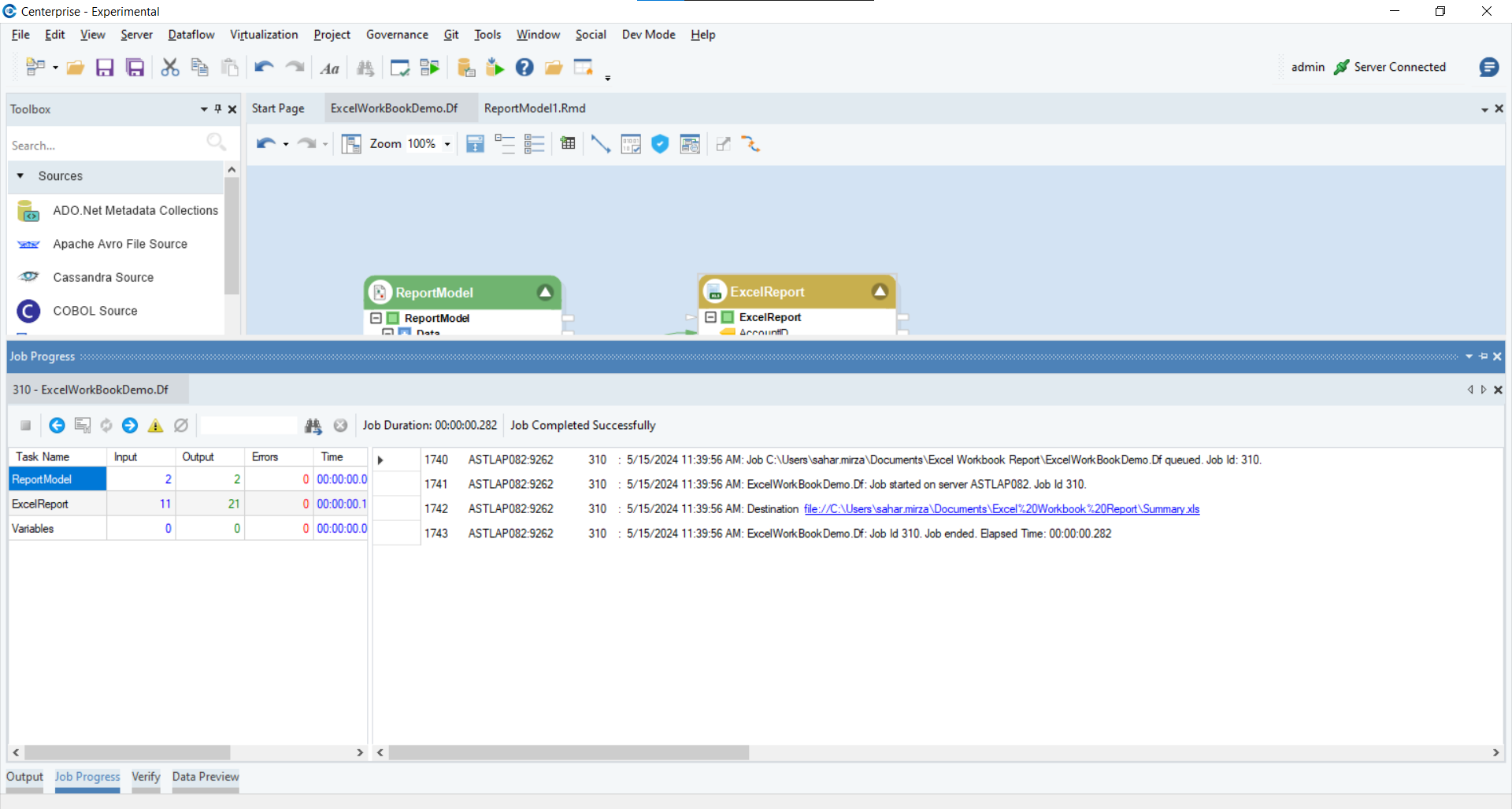 The Excel Report object is successfully configured, and the report file can now be created by running the dataflow.