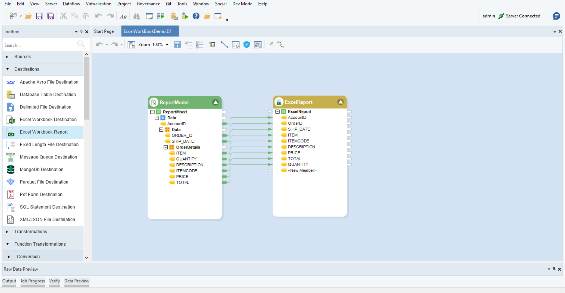 To get the object from the Toolbox, go to Toolbox > Destinations > Excel Workbook Report. If you are unable to see the Toolbox, go to View > Toolbox or press Ctrl + Alt + X.