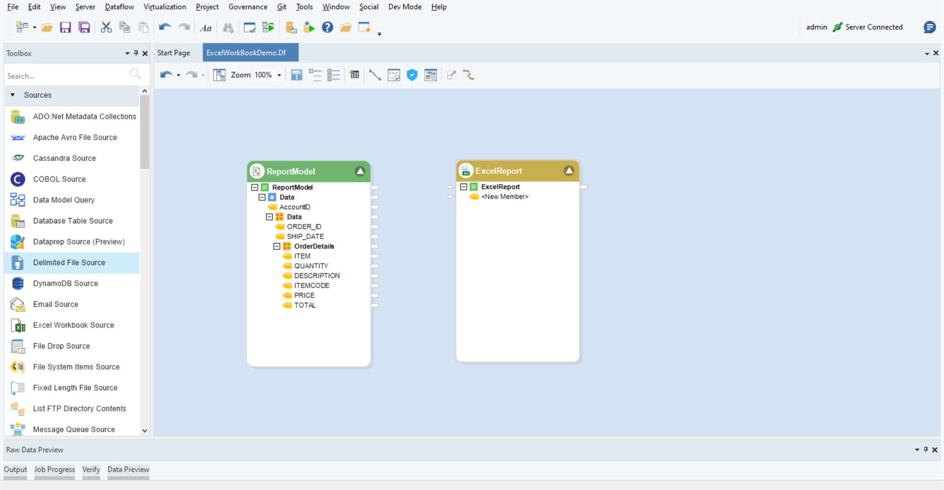 Configure the source object and place it onto the designer next to the Excel Workbook Report object.