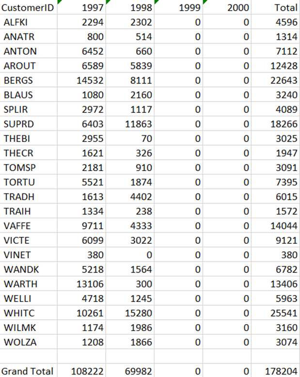 Below, you can see a sample of how the summary report appears. This summary table shows the number of sales across different years for customers, identified by their CustomerID.