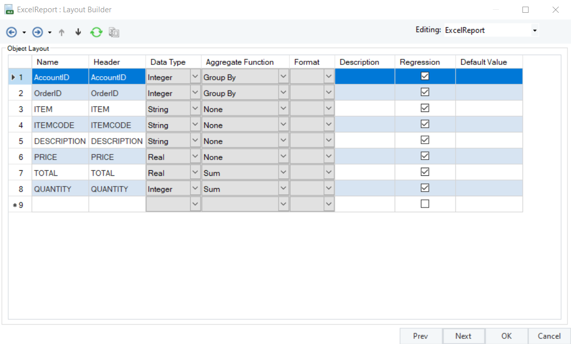 The next window is the Layout Builder. On this window, the layout of the excel report file can be modified.