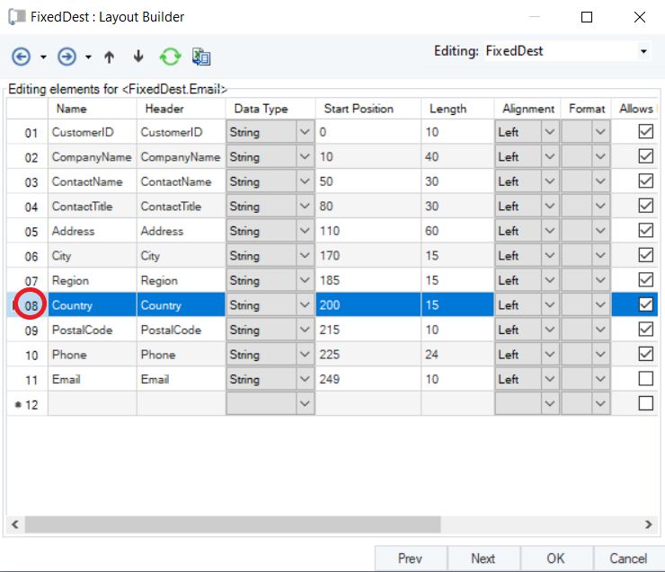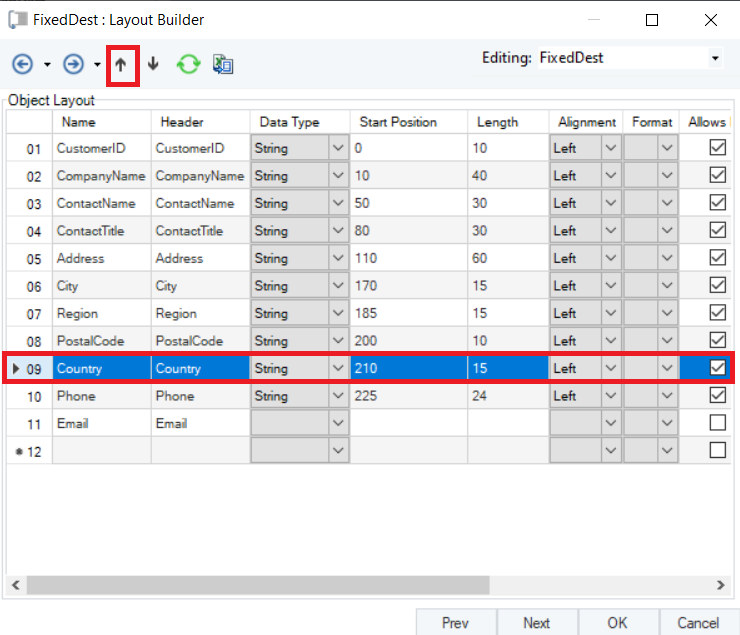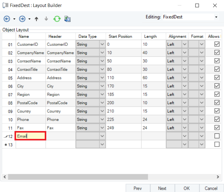 The next window is the Layout Builder. On this window, the layout of the fixed length destination file can be modified.