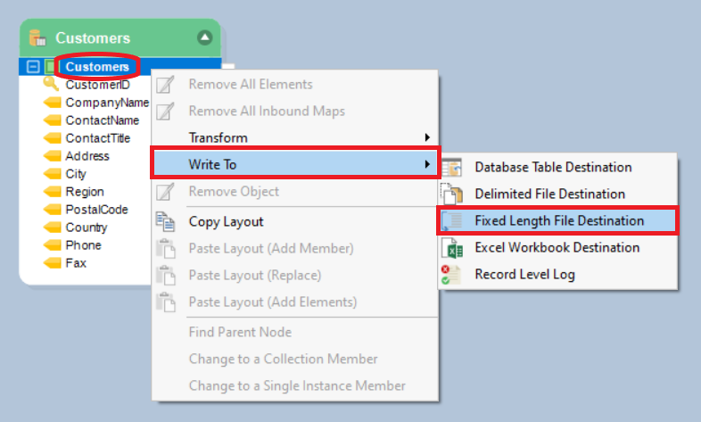 iii. By directly writing the source layout to a Fixed Length File Destination through the source context menu of its parent node.