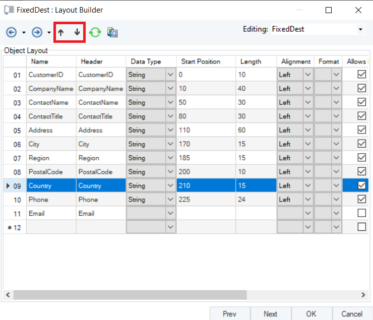 For example: To move the Country field right below the Region field, select the row and use the Move up key to from the 9th row to the 8th row.