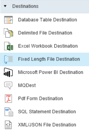 To get a Fixed Length File Destination object from the Toolbox, go to Toolbox > Destinations > Fixed Length File Destination. If you are unable to see the Toolbox, go to View > Toolbox or press Ctrl + Alt + X.