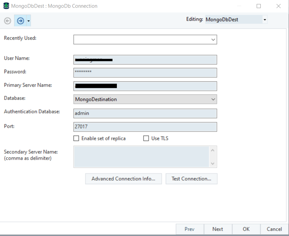 For our use case, we have input the credentials to use the MongoDB Destination for our local server.