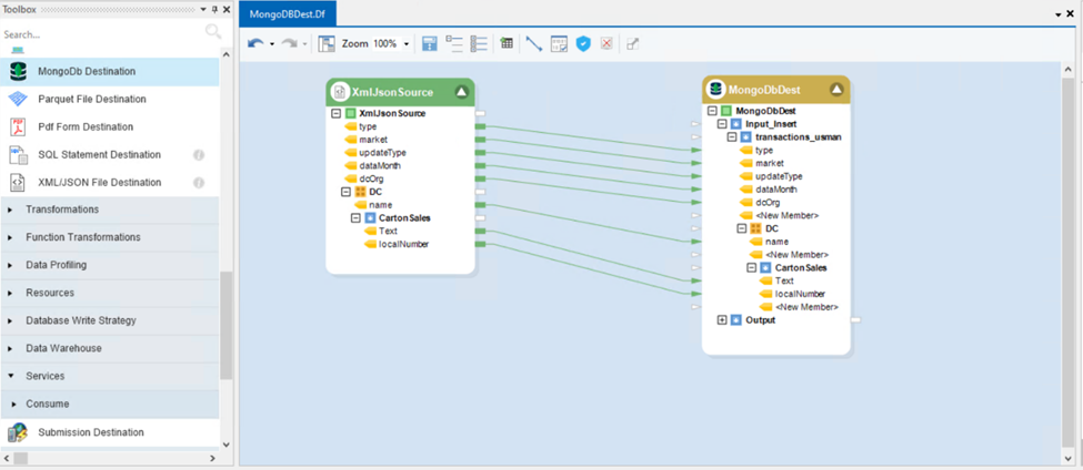 We will map the incoming fields from the XML/JSON Source object to the MongoDB Destination object.