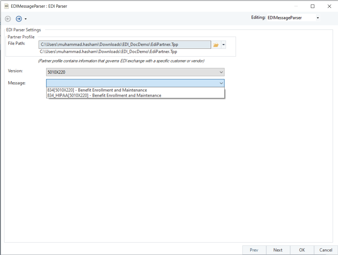 Once this is configured, the EDI Message Parser object automatically uses the dialect and version information from the Partner Profile file in order to parse the source file.