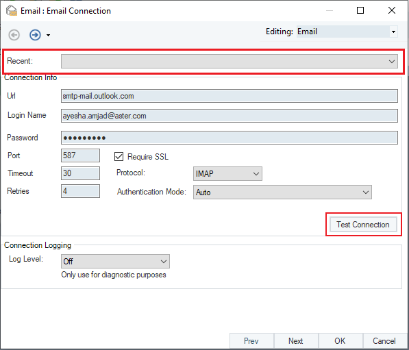 If you have configured email settings before, you can access the configured settings from the drop-down list next to the Recent option. Otherwise, provide server settings for the mailing platform that you want to use. In this case, we are using an Outlook server.