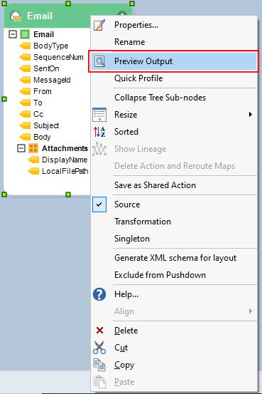 Right-click on the Email Source object’s header and select Preview Output from the context menu.