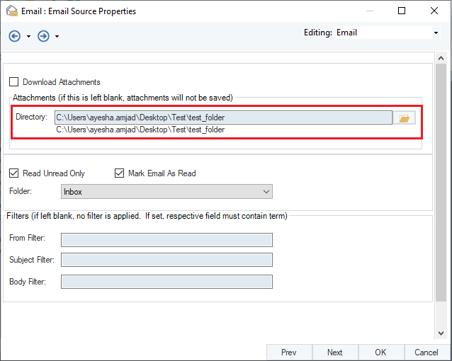 Check the Download Attachments option if you want to download the contents of your email. Specify the directory where you want to save the email attachments, in the provided field next to Directory.