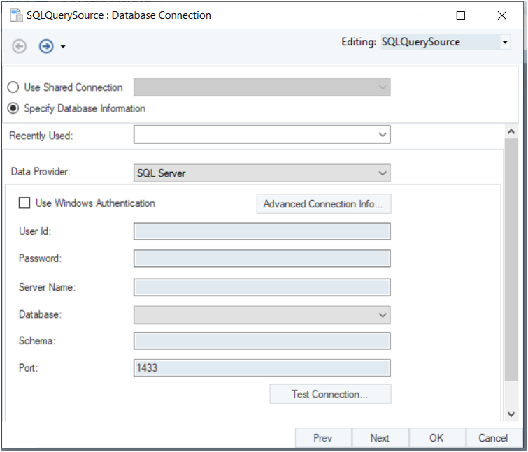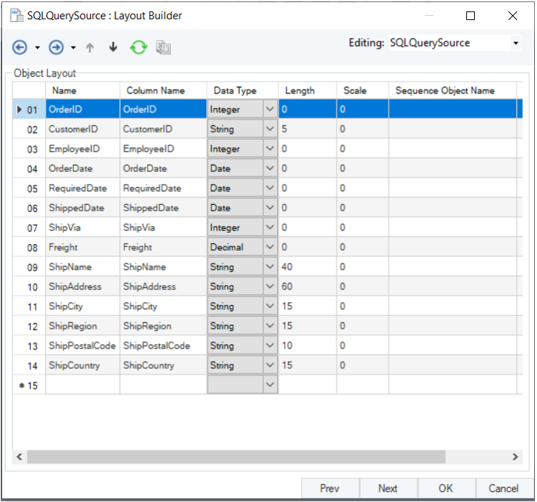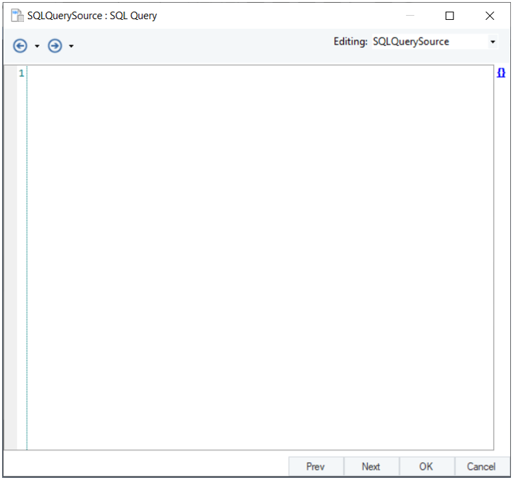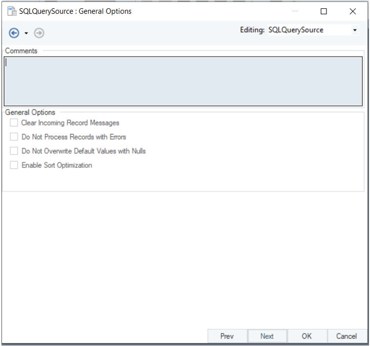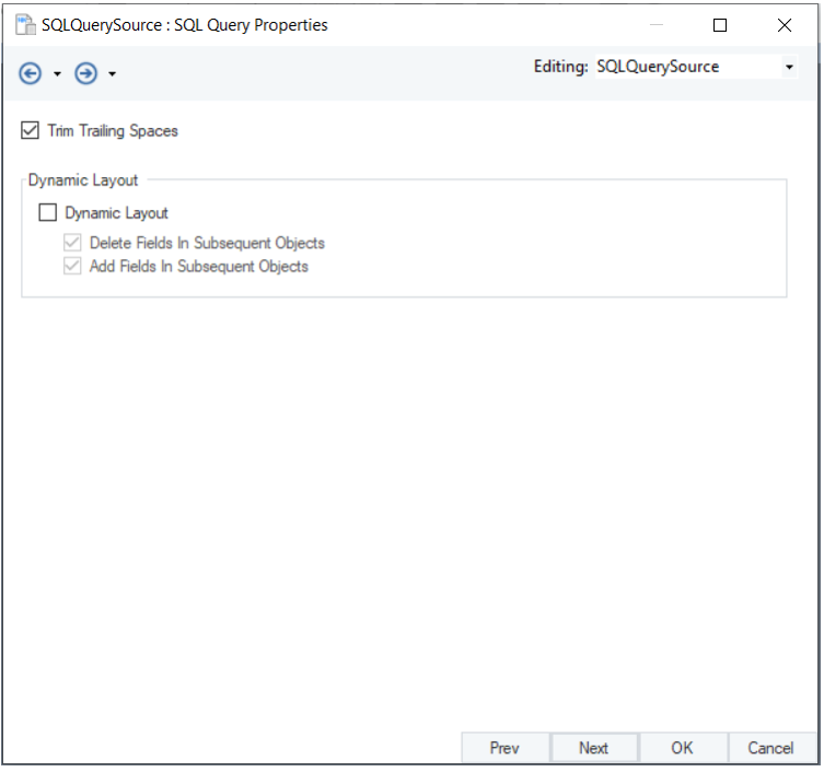In this window, we will configure properties for the SQL Query Source object.