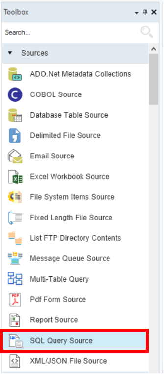 Before moving on to the actual configuration, we will have to get the SQL Query Source object from the Toolbox onto the dataflow designer. To do so, go to Toolbox > Sources > SQL Query Source. In case you are unable to view the Toolbox, go to View > Toolbox or press Ctrl + Alt + X.