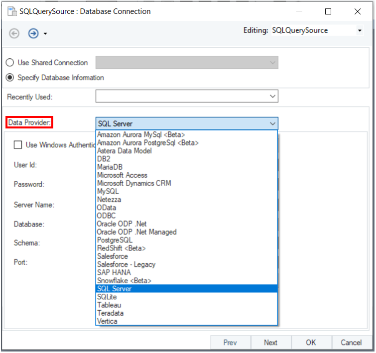 Use the Data Provider drop-down list to specify which database provider you want to connect to. The required credentials will vary according to your chosen provider.