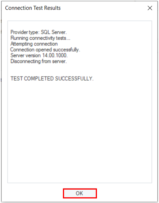 Test Connection to ensure that you have successfully connected to the database. A separate window will appear, showing whether your test was successful. Close this window by clicking OK, and then, click Next.