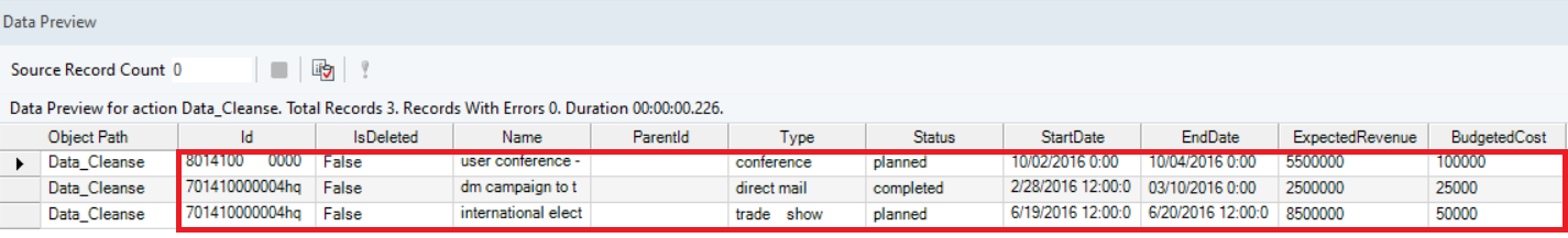 Now, if we look at the output, we can see that the Data Cleanse Transformation Object has found and replaced the status values from ‘Planned’ to ‘Scheduled.’