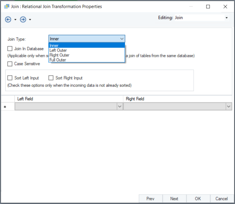 General Options window in Join Transformation: