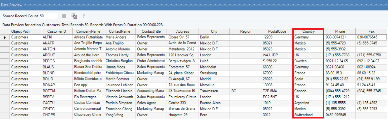In this example, we are working with a Customers Fixed-Length File Source that contains customer information for a fictitious organization. The Customers data contains information about customers belonging to different countries. We want to convert the country names in this data into CountryCodes by using the List Lookup transformation object.