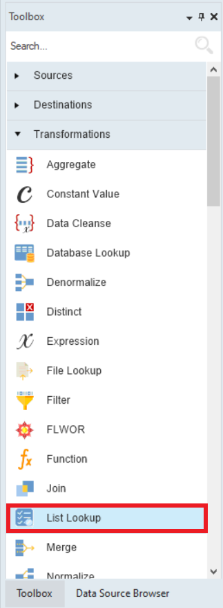 To start working, drag-and-drop the List Lookup object from Toolbox>Transformations>List Lookup.