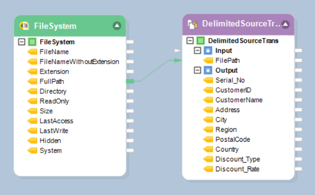Map the FullPath field from FileSystem to the DelimitedSource object’s input node (FilePath).