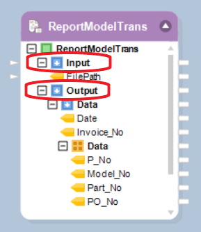 Output node: When expanded, you will be able to see the data fields that are in the report source file. You can map these fields to other objects in the dataflow through the output mapping ports.