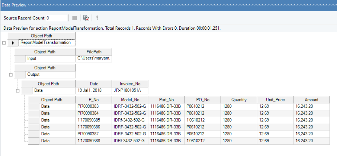 On selecting Preview output, you will be able to view the data in the Data Preview pane. The data that you see in the above image is in its condensed form. To expand the data and preview your output, you need to click on the +icon right next to the root node – ReportModelTran. And then to further expand the data, click on the +icon right next to the sub node – Output.